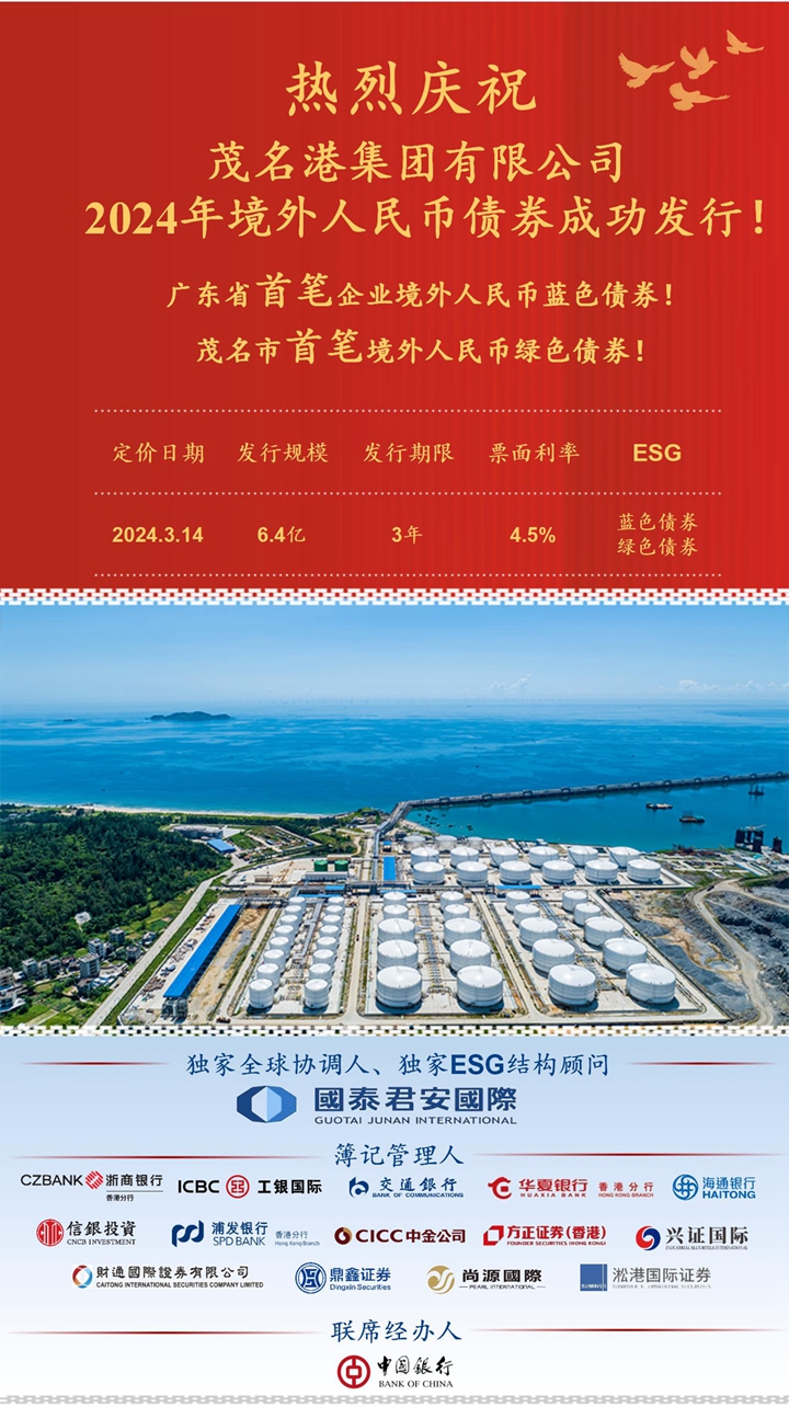 3月14日,茂名港集團有限公司成功定價2024年境外人民幣債券,發(fā)行規(guī)模6.4億人民幣、票息4.5%。債券在香港和澳門兩地交易所上市,作為廣東省首筆企業(yè)境外藍色債券、茂名市首筆境外人民幣綠色債券,為清潔能源、綠色交通、可持續(xù)發(fā)展的新質生產力等重要領域提供了資金支持。
