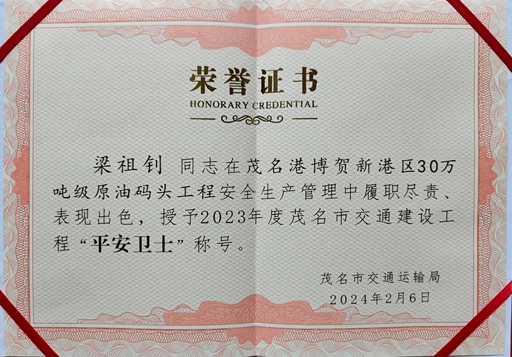 茂名市交通建設(shè)工程“平安衛(wèi)士”、30萬(wàn)噸級(jí)原油碼頭工程項(xiàng)目經(jīng)理梁祖釗表示:“30萬(wàn)噸級(jí)原油碼頭工程項(xiàng)目榮獲“平安工地”榮譽(yù)稱(chēng)號(hào),不僅是茂名市交通局對(duì)我們項(xiàng)目團(tuán)隊(duì)辛勤付出的肯定,更是對(duì)我們安全管理工作的最高褒獎(jiǎng)。作為項(xiàng)目經(jīng)理,我深感榮幸與自豪,同時(shí)也深知這份榮譽(yù)背后所承載的責(zé)任與擔(dān)當(dāng)。在集團(tuán)黨委的堅(jiān)強(qiáng)領(lǐng)導(dǎo)和集團(tuán)安環(huán)委的正確指導(dǎo)下,我將繼續(xù)和項(xiàng)目團(tuán)隊(duì)成員共同努力把項(xiàng)目安全工作抓好管好!為集團(tuán)重點(diǎn)項(xiàng)目高質(zhì)量建設(shè)保駕護(hù)航!”(通訊員:張春浩)