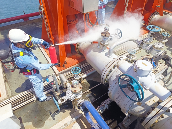 演練現(xiàn)場,警報聲響起,人員、車輛迅速集結(jié)到位。按照搶險救災(zāi)組、疏散警戒組、通訊聯(lián)絡(luò)組、后勤保障組、醫(yī)療救護組、后勤醫(yī)療組等五個工作組的分工要求,參演人員各就各位、各司其責(zé)。他們有的迅速疏散無關(guān)人員完成現(xiàn)場警戒;有的迅速向市公司指揮中心及相關(guān)部門報告情況;有的迅速使用消防水泵泡沫泵、干粉滅火器撲滅初期火災(zāi),并對泊位E2裝卸區(qū)進行全面冷卻;有的迅速開展醫(yī)療及后勤等方面的應(yīng)急處理。各參演小組反應(yīng)快速、緊密配合、協(xié)同作戰(zhàn),現(xiàn)場警戒、人員疏散、滅火救援、后勤保障等各項應(yīng)急動作有序進行,處理流程和處理措施合理有效。