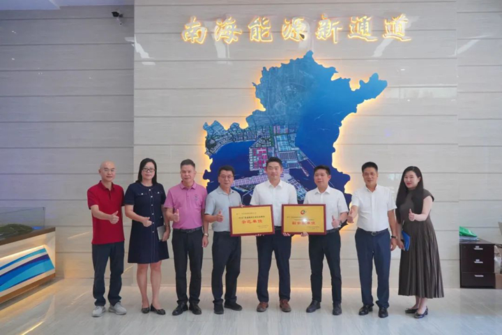 蔣斌一行首先察看博賀新港區(qū)規(guī)劃沙盤(pán)及企業(yè)文化墻并舉行了授牌儀式。他代表廣東省企業(yè)文化研究會(huì)向集團(tuán)授予了“副會(huì)長(zhǎng)單位”及“2024廣東省推動(dòng)企業(yè)社會(huì)責(zé)任示范單位”榮譽(yù)稱號(hào),朱廣宇代表茂名港集團(tuán)接受兩項(xiàng)榮譽(yù)牌匾。